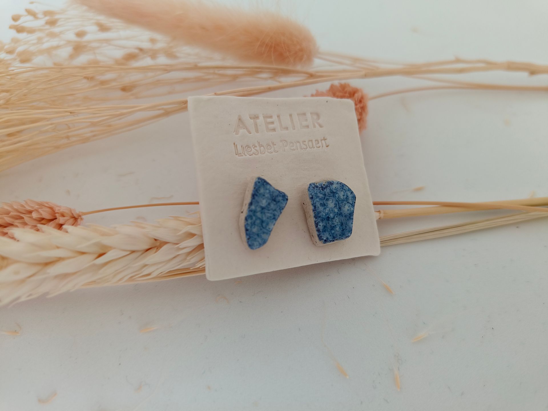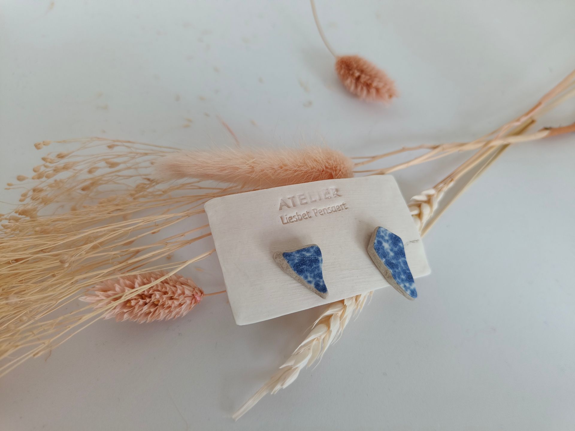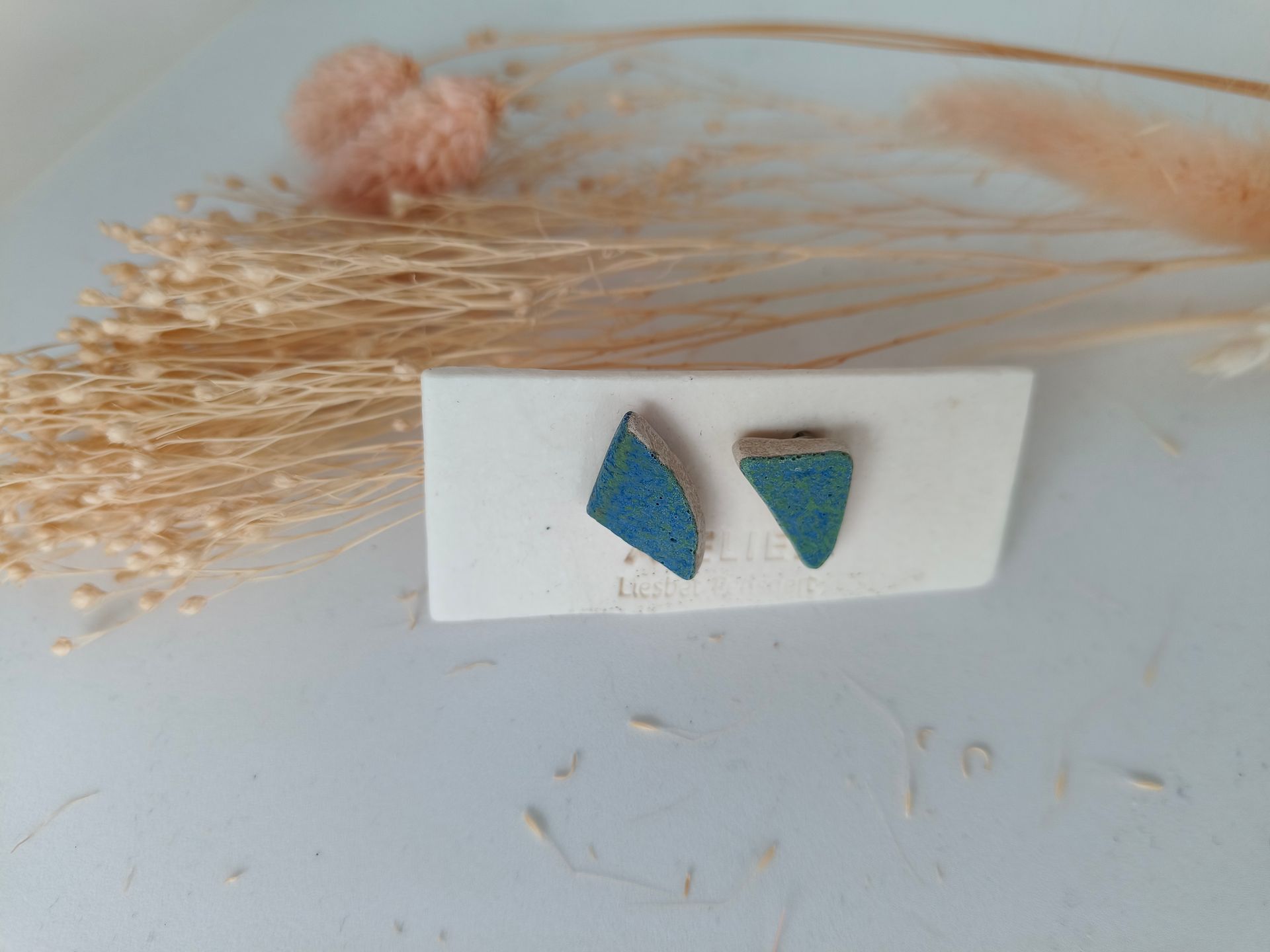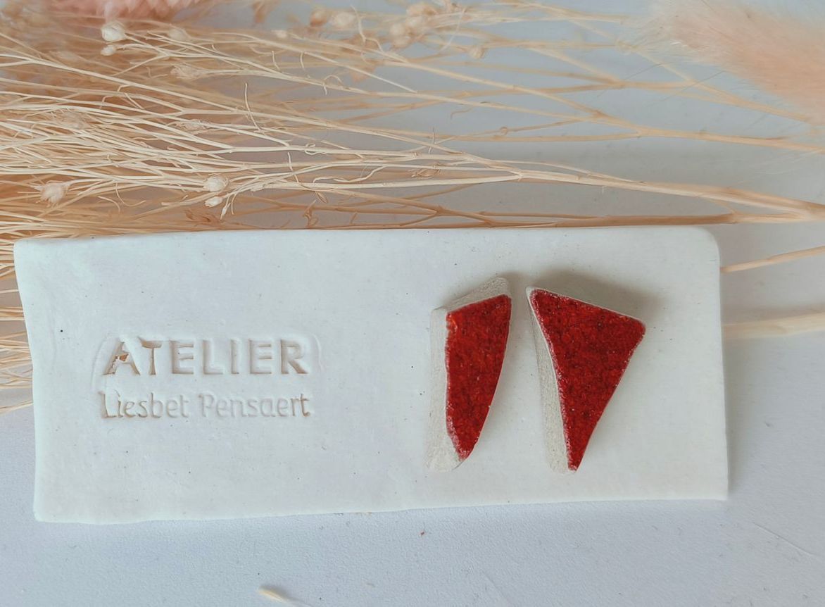 Oorbellen gemaakt uit gebroken stukjes van eigen gemaakte keramiek
